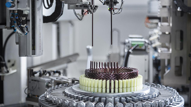 全自動插線機具備可編程整體式線杯編繞功能,兼容任意繞線設計,包括線杯組合、線杯梳理、整體搬運和壓裝功能模塊,解決線杯組合過程中的層間跳線組裝、線腳凌亂難入鐵芯、壓裝過程線腳變型等難題,為高層扁線電機的復雜繞線設計提供領先行業的插線解決方案。